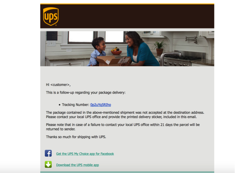 Once everything is worked out we suggest testing the phishing email, potentially your testing POC from the target organization if allowed. Below is an example of a finalized phishing email for the UPS Tracking scenario described above: