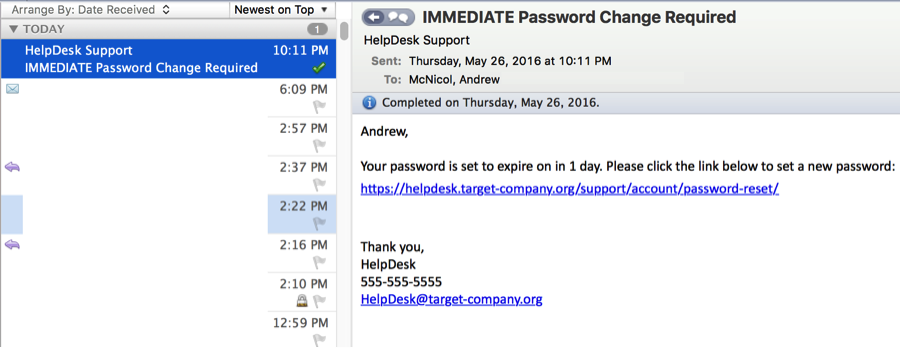 Below is an example of a phishing email that was sent using Gmail, but to the user it looks like it is coming from the Help Desk: